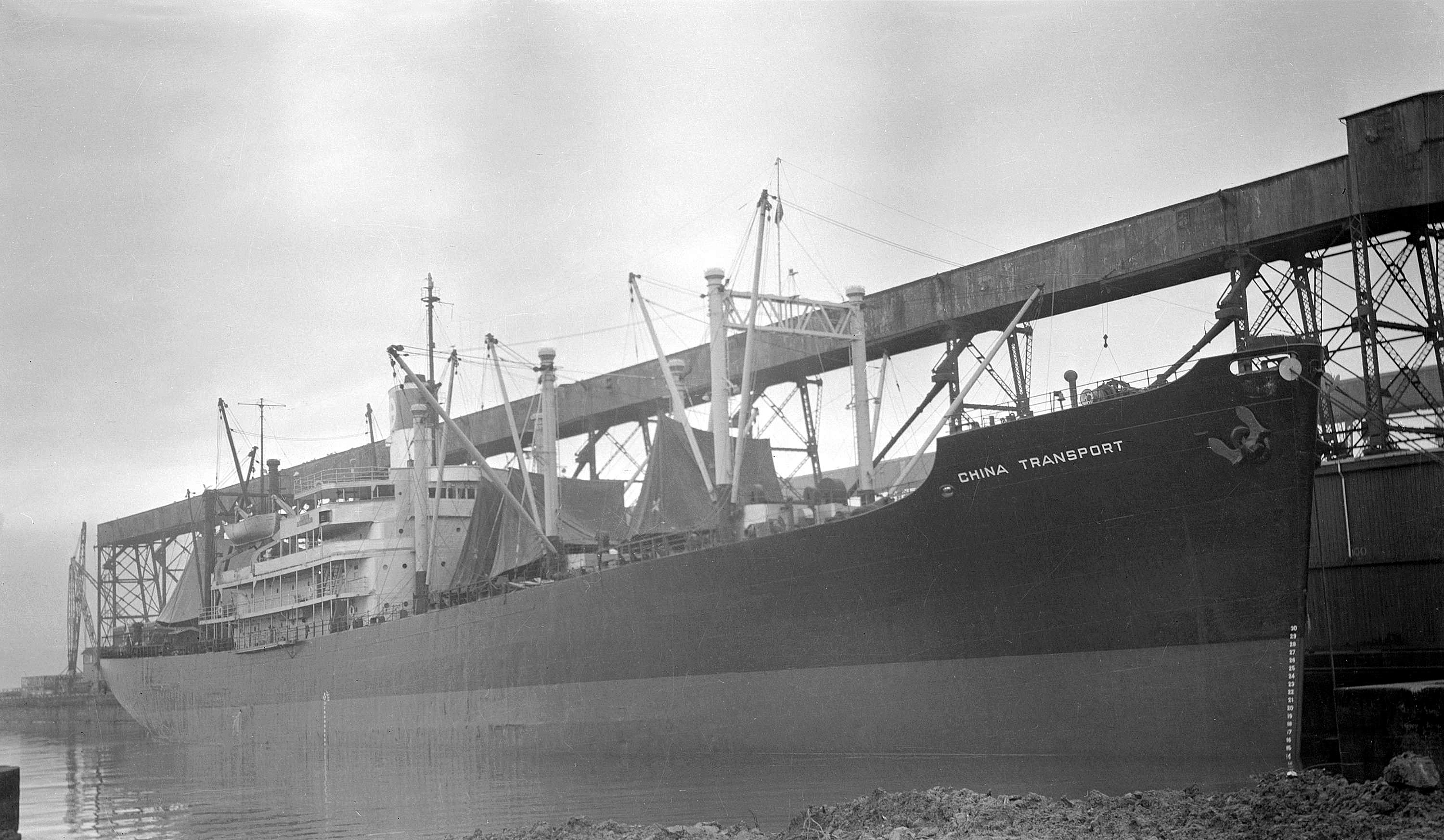 SS China Transport at dock, Pacific Transport Lines, at Vancouver, BC, Canada on 26 Feb 1957. City of Vancouver Archives. Photograph by Walter E. Frost. Click to zoom