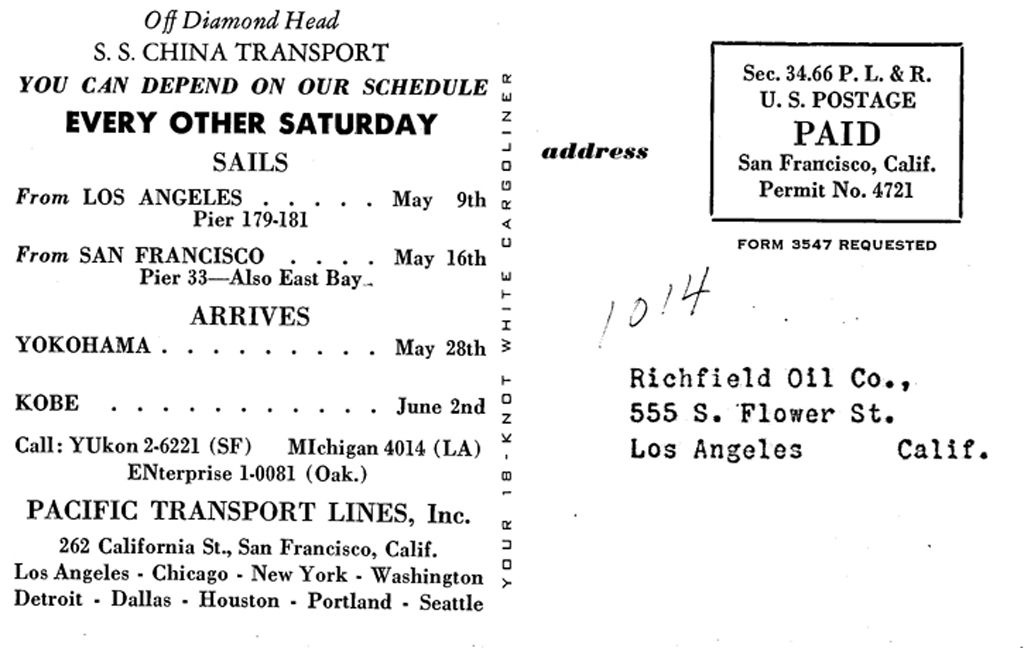 PTL advertisement postcard (flipside) featuring SS China Transport. Click to zoom.