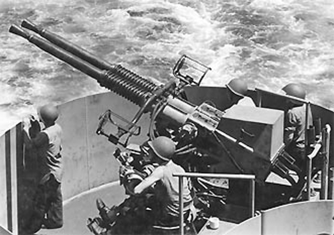 These cannon were not what you could consider ‘portable’. Weighing in at nearly 150-pounds with rather serious recoil, the gun could not be carried by a light vehicle let alone a squad of soldiers. The main use was in mounting it to ships at sea for the purpose of stitching up surface targets like small boats and shooting down attacking aircraft. In a pinch, they could also be used to suppress fire ashore on the beaches if the ship was brought in close enough.